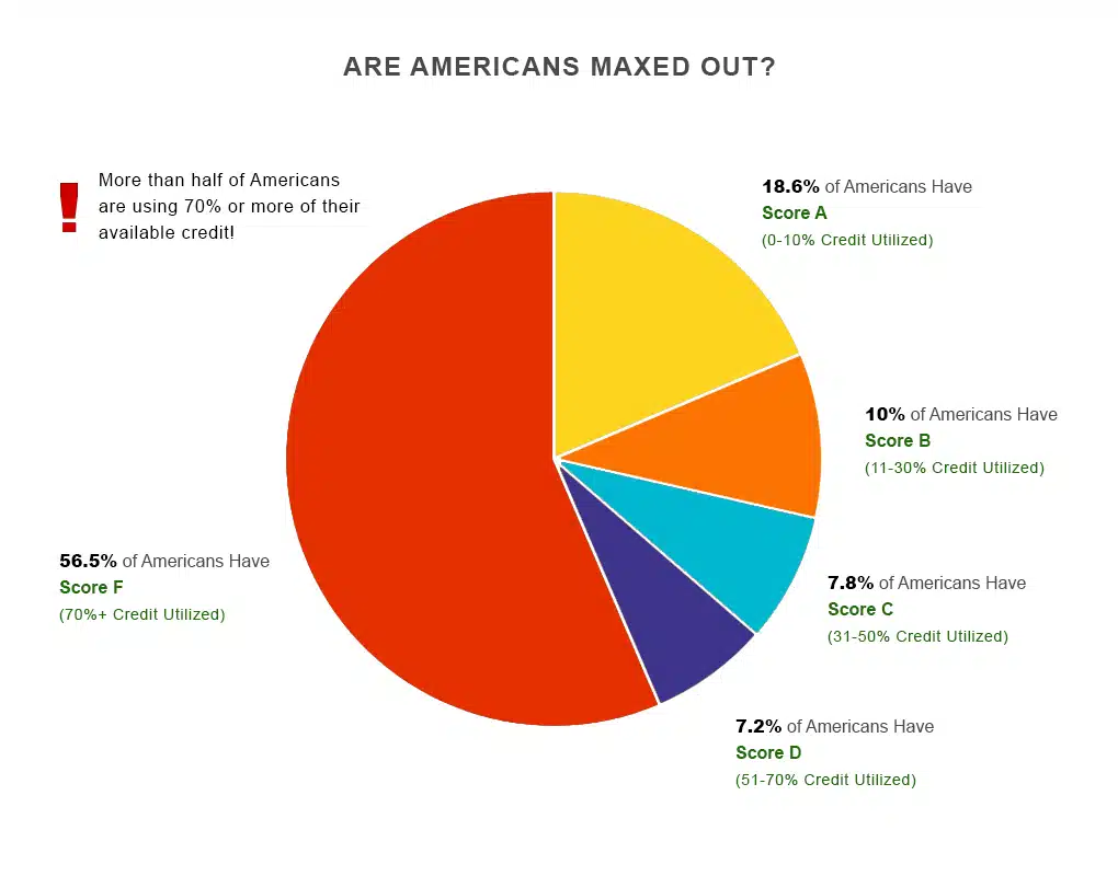 If you’re dealing with a high utilization, don’t worry, you’re not alone. According to data gathered from a subset of Credit Sesame’s 8 million members, we discovered that more than half are using 70% or more of their available credit. (Your utilization is directly tied to a credit letter grade, which is why the lower the utilization rate, the higher your letter grade, as it shows in the pie chart below.)